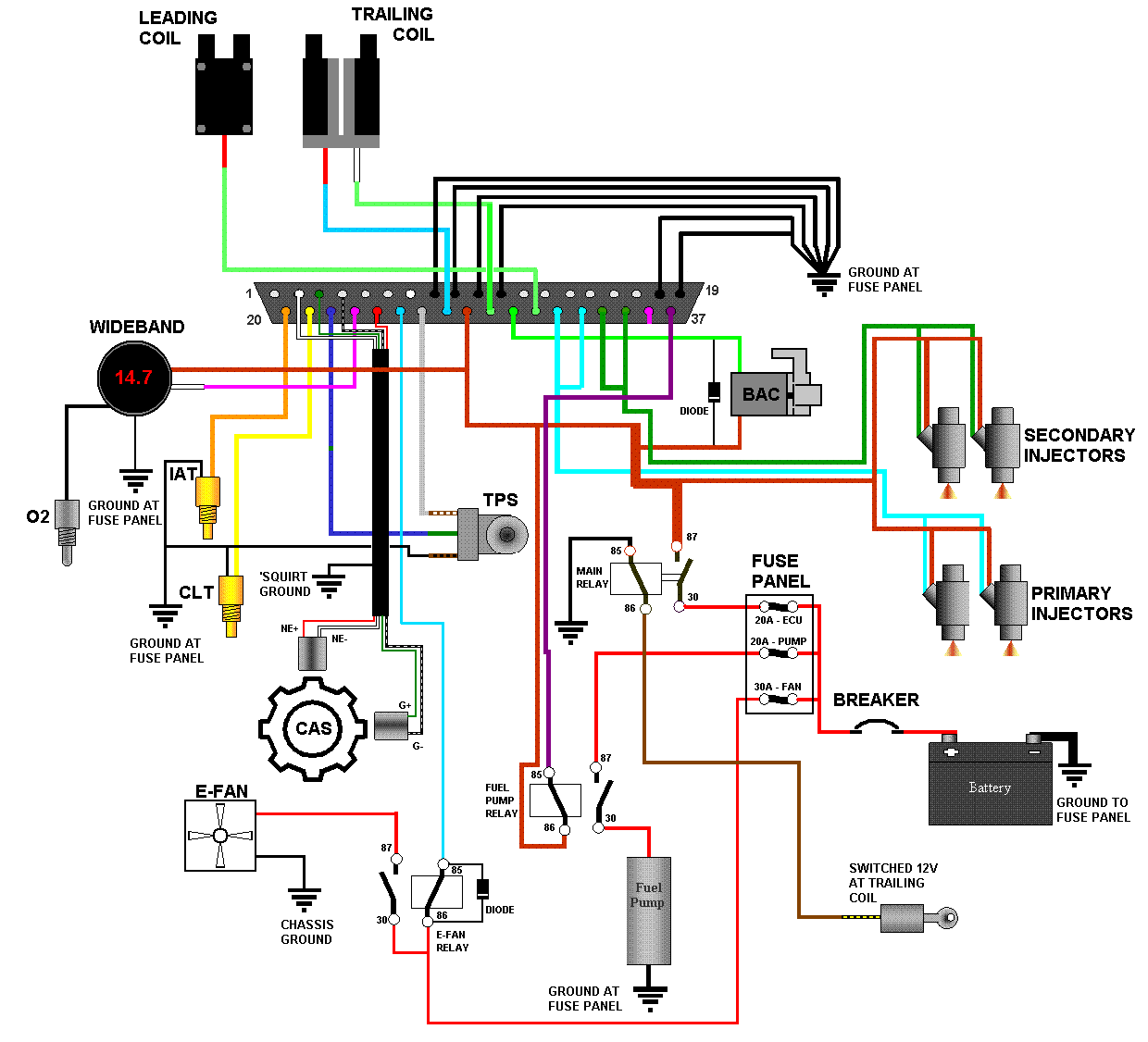 Connect terminal 87 on the relay to the fans 12V+ connection. Then ground the fans negative connection to a good spot on the chassis using a ring terminal and plenty of dielectric grease. You need to insert a diode between the positive wire to the relay coil and the Megasquirt wire just as you did for the BAC valve. So, connect terminal 85 on the relay to both the non-banded end of a diode, and IAC1A (pin 25 on the DB37) as described in the BAC instructions. Connect both pins 30 and 86 on the relay to the red 12 gauge 12V wire and the banded end of the diode. Refer to the schematic if those instructions are a bit confusing. Now heat shrink everything up and mount the relay and socket to the chassis of the car.