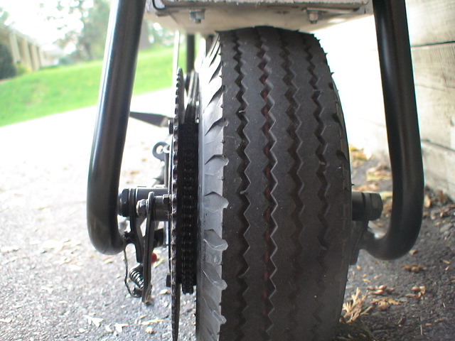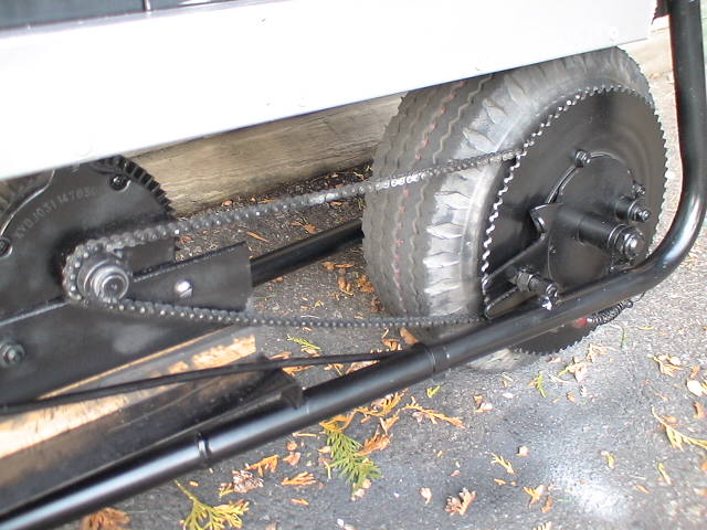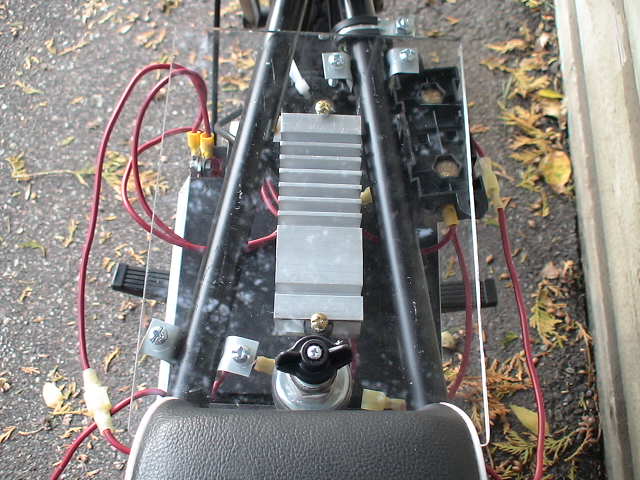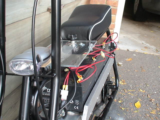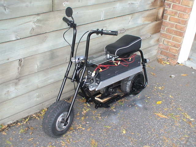 Hi, I finished building my minibike over the summer and I just thought I should show the final result. I think it's awesome, thanks for your help. It's really fun to ride it at night because it's so quiet and stealthy and no one is around. Here are some basic specs: top ground speed: -25+ (if it's fully charged) downhill speed: -30+ freewheeling motor sprocket: 15 teeth custom rearwheel sprocket: 70 teeth (25 heavy duty chain) raw motor specs: 36V 1000W 2600RPM 32A 100A controller, Magura twist throttle, drum brake 3 12V 26Ah SLA batteries