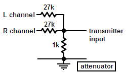 Posted - Dec 05 2009 : 09:51:18 AM The circuit is designed for an electret mic that has an output level of about 10mV. The resistor that powers the mic must be removed. But an MP3 player or CD player has an output of about 270mV so an attenuator can be used that also mixes the stereo channels into mono like this: