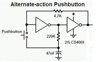 An "alternate action" circuit has an output that goes high when its button is pushed then it goes low if the button is pushed again. Its output alternates each time the button is pushed. Inverting gates can be used instead of inverters.