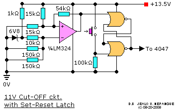 Sir, what components (except Logic gates) can be added in my ckt. (below) to put a "high" on the 4047 Pin9 (reset) to turn-off the MSW Inv. when the battery voltage reaches 11V ?