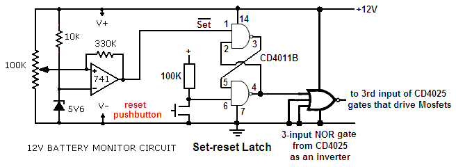 My circuit uses 3-input NOR gates to drive the Mosfets. This circuit drives the third input high which shuts off the Mosfets. The opamp comparator SETS the flip-flop to turn off the Mosfets when the battery voltage is low. The flip-flop is manually RESET so that when the battery voltage rises when the inverter is turned off (when the battery voltage is detected low by the comparator) then the Mosfets are not turned on again. The reset button is pushed to start the inverter when the battery is fully charged. |