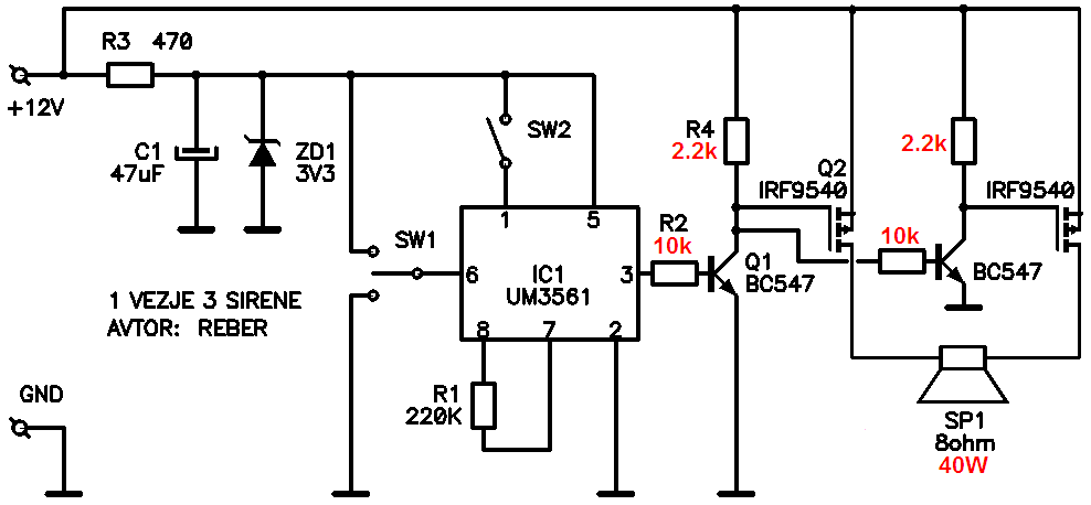 Here is the shematic for 12V version. http://www.reber.si/zvocni_efekti/UM3561/UM3561-12V.sch-200dpi.gif The spiker is for car alarm and I think that is good, if you mean that. The horn works properly, but it is to silent, so I need a way how to decrease the output signal.