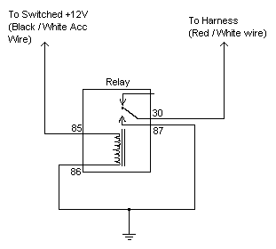 Method 2: Connect the wire though a relay. The wire will be connected to ground, with a relay in series with that connection. The relay can then be activated by a +12V signal. That signal can come from the accessory line, or ignition line. This provides automatic control of the lights. One side of the relay coil is connected to ground, the other end is connected to your switches +12V source. If you would like to use the ignition or accessory wire, you will find the black wire with the white stripe on the steering column harness very convenient. This will light the lights when the car is running or the ignition key is in the "run" position. You can, of course, connect a switch in series with this connection to retain manual turn-off capability of the lights. The schematic below should help you: