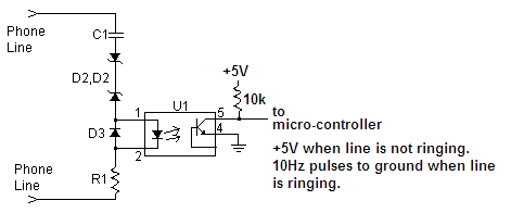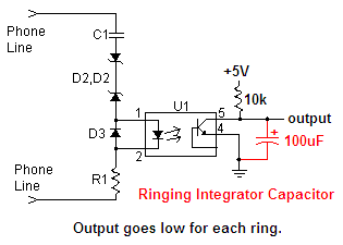 Posted - Feb 10 2008 : 4:56:32 PM Yes, the output will be high at rest and will be low during each ring. For local calls, my phone line rings for 2 seconds then has a 4 seconds pause before the next 2 seconds of ringing.
