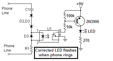 I just noticed that the original circuit operates backwards. The relay is turned OFF when the phone rings. My circuit copied the mistake so my LED also turns OFF when the phone rings.