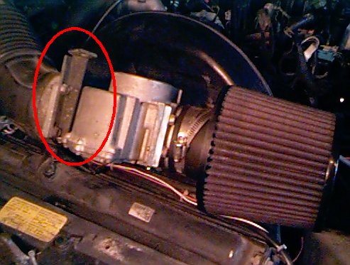 This is where we differ from the instructions supplied with the kit. What you need to do is take one of the left over airbox mounting brackets, and attach it to the back of the AFM. First, remove the clamp holding the intake duct on, then remove the duct. Now position the bracket as shown in the picture below and bolt it down. You may then reinstall the duct.