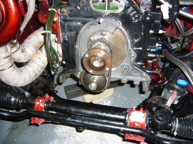 With all the work on the front cover complete, it was repainted and reinstalled on the engine. Note my custom made front hub holder tool. It's made of the little ring inside the stock pulleys and a spare length of square 1" tubing. Also notice that I installed studs on the bottom of the front cover. This makes it a hell of a lot easier to install the oil pan (and oil baffle plate) from underneath the car as you can hook the front on the studs after sticking the gasket in place with sealant.
