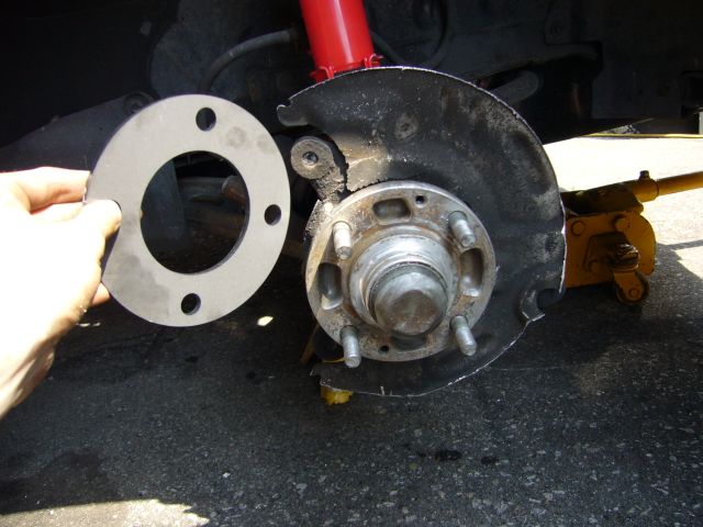 It was time to bolt up the caliper, and it's here I ran into a small snag. It seems that Mazda decided to make the cast face of the 4 lug rotor a lot thicker then the 5 lug. Placing the redrilled 5 lug rotor onto the 4 lug hub made it seem as if it fits, but this is not so. Once the caliper was bolted in place, the back of the rotor scrapped the caliper. Confused, I measured the thickness front to back of both rotors. It turned out the same so that was not the cause. I then measured the thickness of the face of the hat on both rotors and found my issue. It seems the face of the 4 lug rotor is about 4MM thicker then the face of the 5 lug rotor. Thus, the 5 lug rotor sat further back off of the hub and smacked the caliper. To overcome this I stacked washers behind the rotor to move it back out to the center of the caliper. Below is a mockup of the brake setup using the washers as a spacer.
